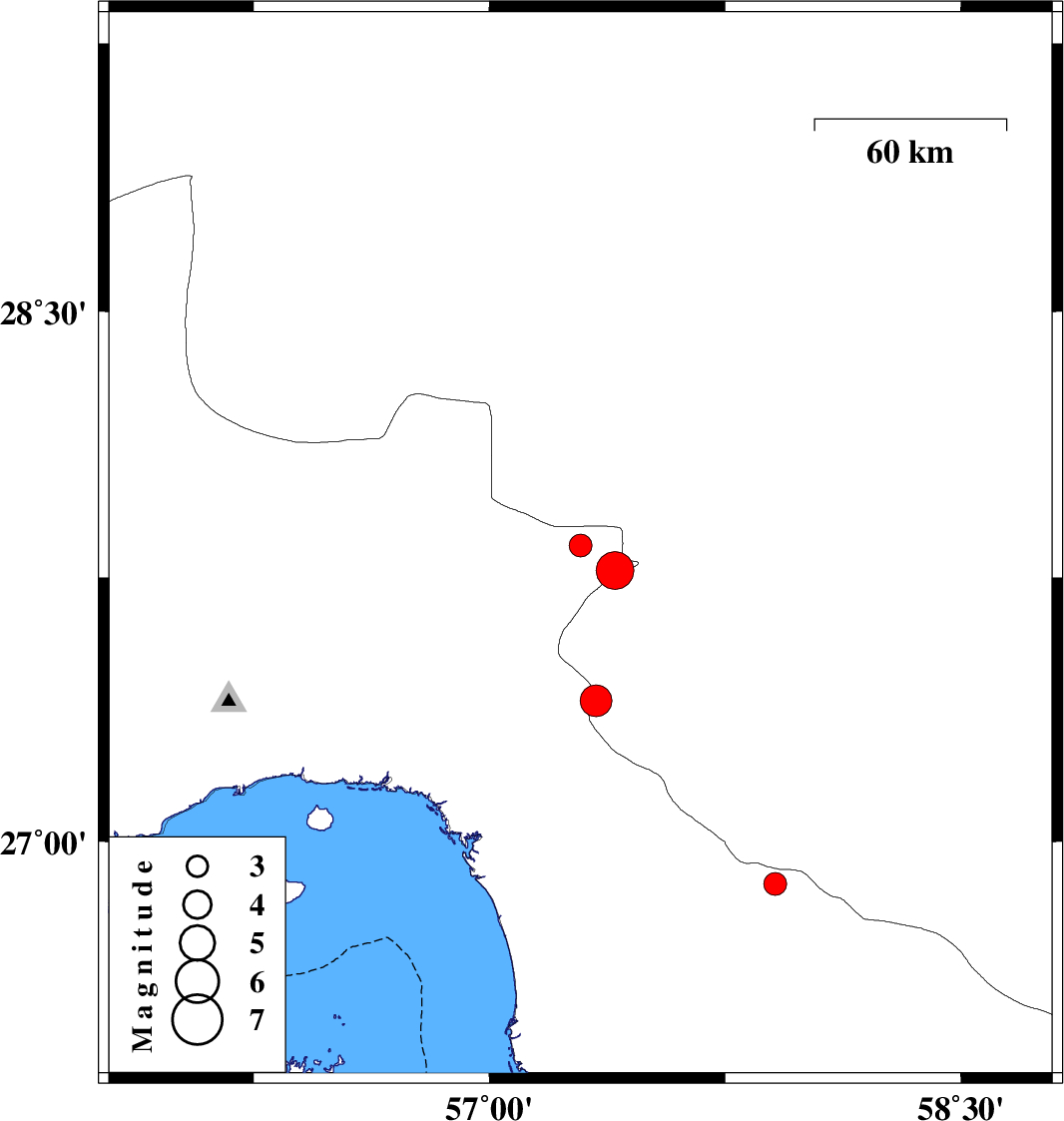 | 2014/10/21 | 22:47:01.5 | 02:17:01.5 | 27.4 | 57.34 | 15 | ML4.5 | Kerman Province, 10 km Dehbarez |