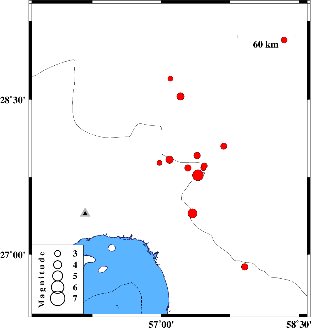 | 2014/10/08 | 05:59:39.8 | 09:29:39.8 | 27.96 | 57.39 | 14 | ML3.3 | Kerman Province, 30 km West of Kahnuj | ||