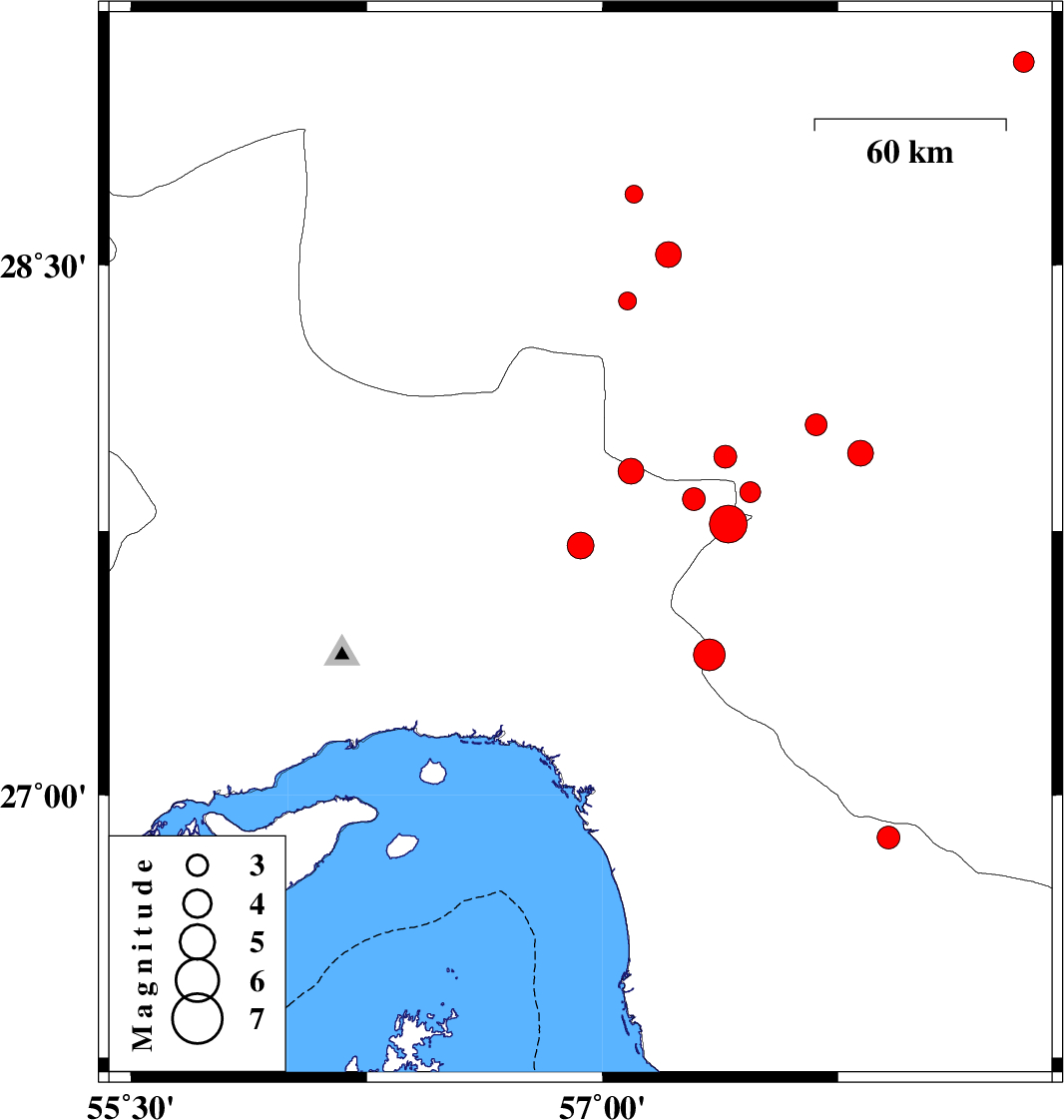 | 2014/10/26 | 10:13:46.7 | 13:43:46.7 | 27.97 | 57.82 | 15 | ML3.6 | Kerman Province, 13 km East of Kahnuj | ||