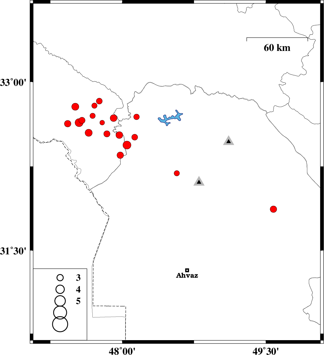 2014/10/27 | 06:08:02.2 | 09:38:02.2 | 32.64 | 47.79 | 18 | ML2.2 | Ilam Province, 50 km East of Dehloran | ||