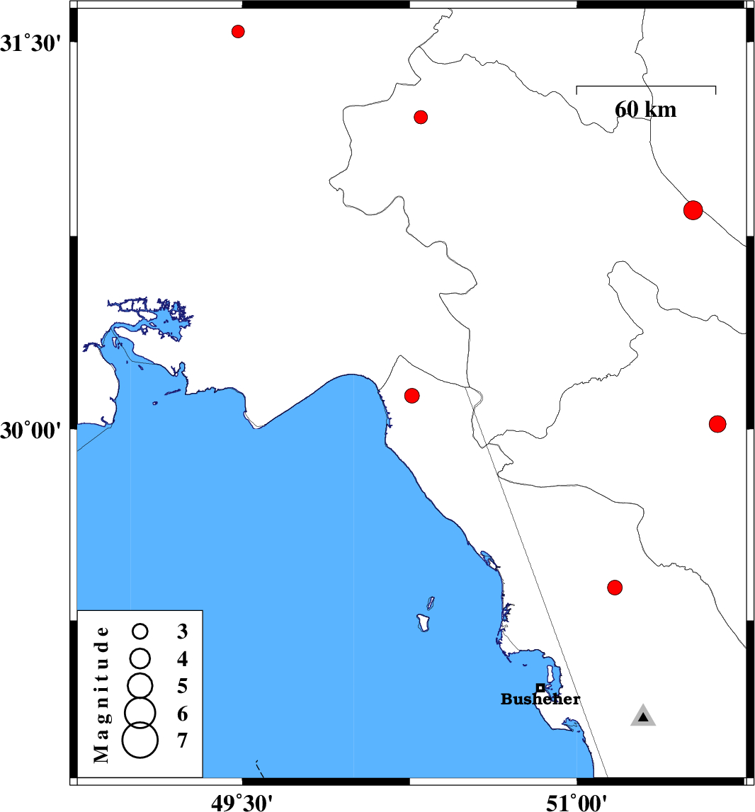 | 2014/11/10 | 22:47:02.1 | 02:17:02.1 | 29.38 | 51.17 | 14 | ML3 | Bushehr Province, 14 km North of Borazjan | ||