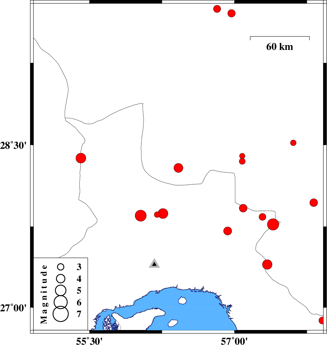 | 2014/11/06 | 18:43:30.2 | 22:13:30.2 | 26.97 | 55.04 | 16 | ML4.5 | Hormozgan Province, 53 km North-East of Bandar-e lengeh | ||