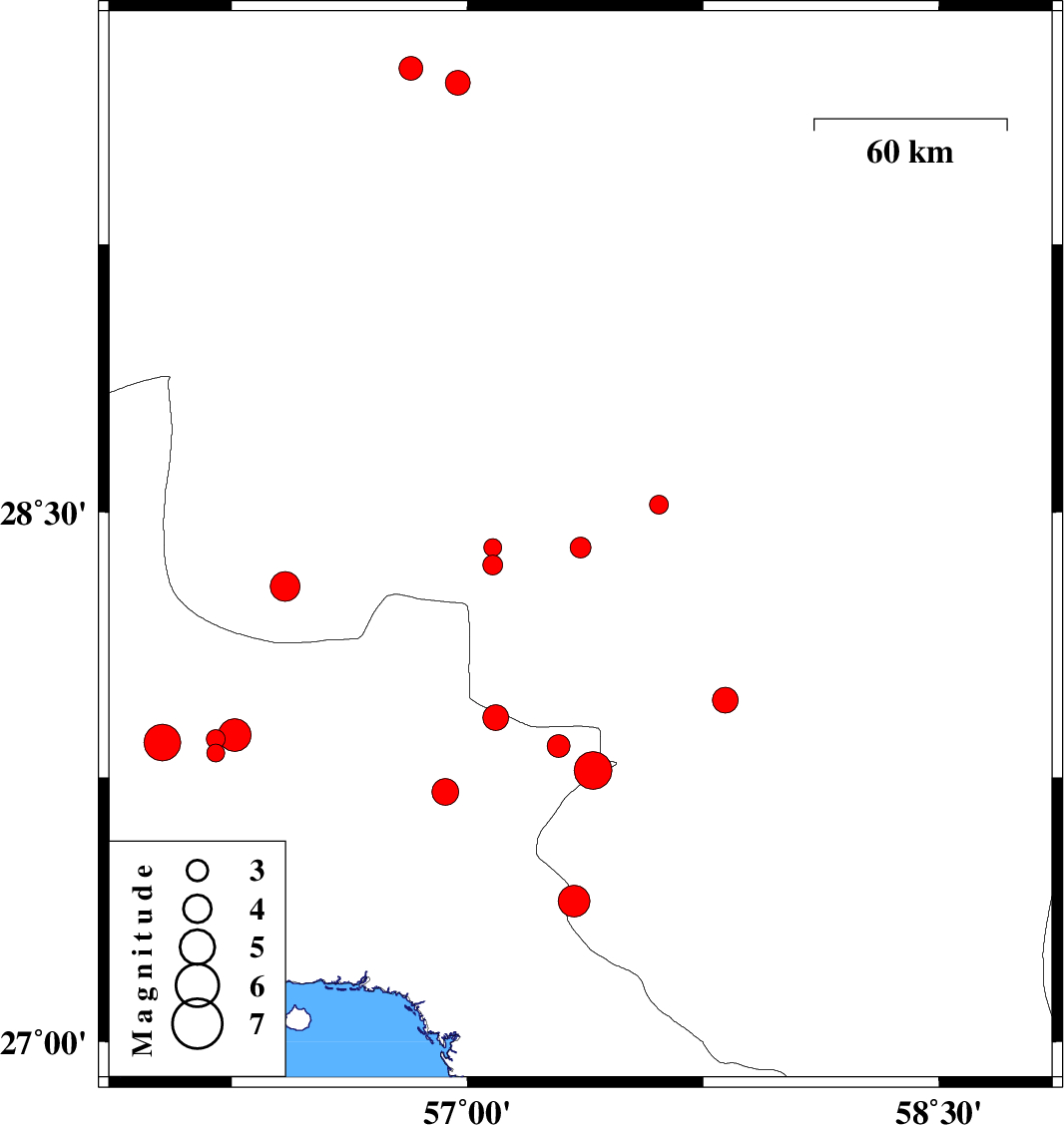 | 2014/10/21 | 22:47:01.5 | 02:17:01.5 | 27.4 | 57.34 | 15 | ML4.5 | Kerman Province, 10 km Dehbarez |