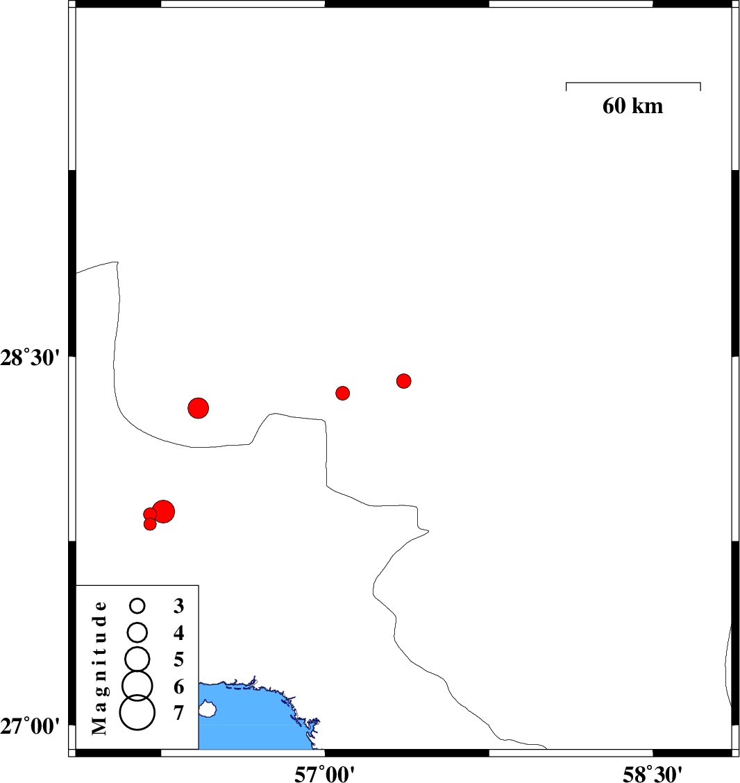 | 2014/11/18 | 01:07:49.4 | 04:37:49.4 | 28.4 | 57.36 | 15 | ML3 | Kerman Province, 48 km South-West of Jiroft | ||
