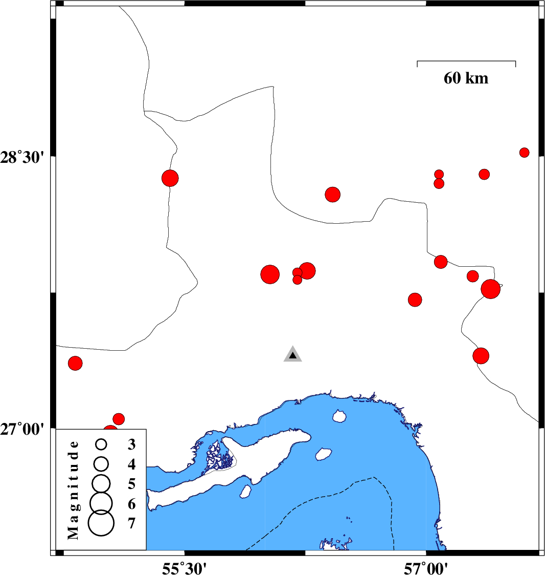 | 2014/11/06 | 18:43:30.2 | 22:13:30.2 | 26.97 | 55.04 | 16 | ML4.5 | Hormozgan Province, 53 km North-East of Bandar-e lengeh | ||