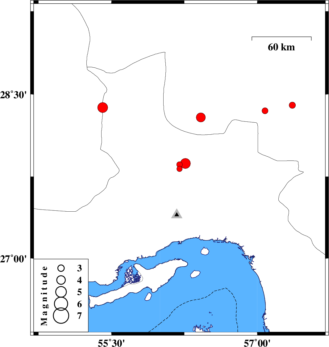 | 2014/11/16 | 05:13:05.2 | 08:43:05.2 | 28.29 | 56.42 | 16 | ML4.3 | Kerman Province, 50 km East of Hajiabad | ||