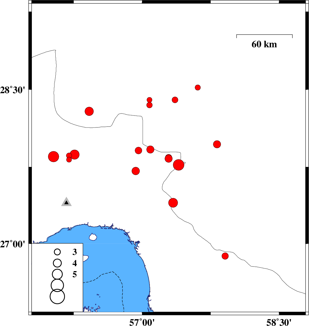 | 2014/10/26 | 10:13:46.7 | 13:43:46.7 | 27.97 | 57.82 | 15 | ML3.6 | Kerman Province, 13 km East of Kahnuj | ||