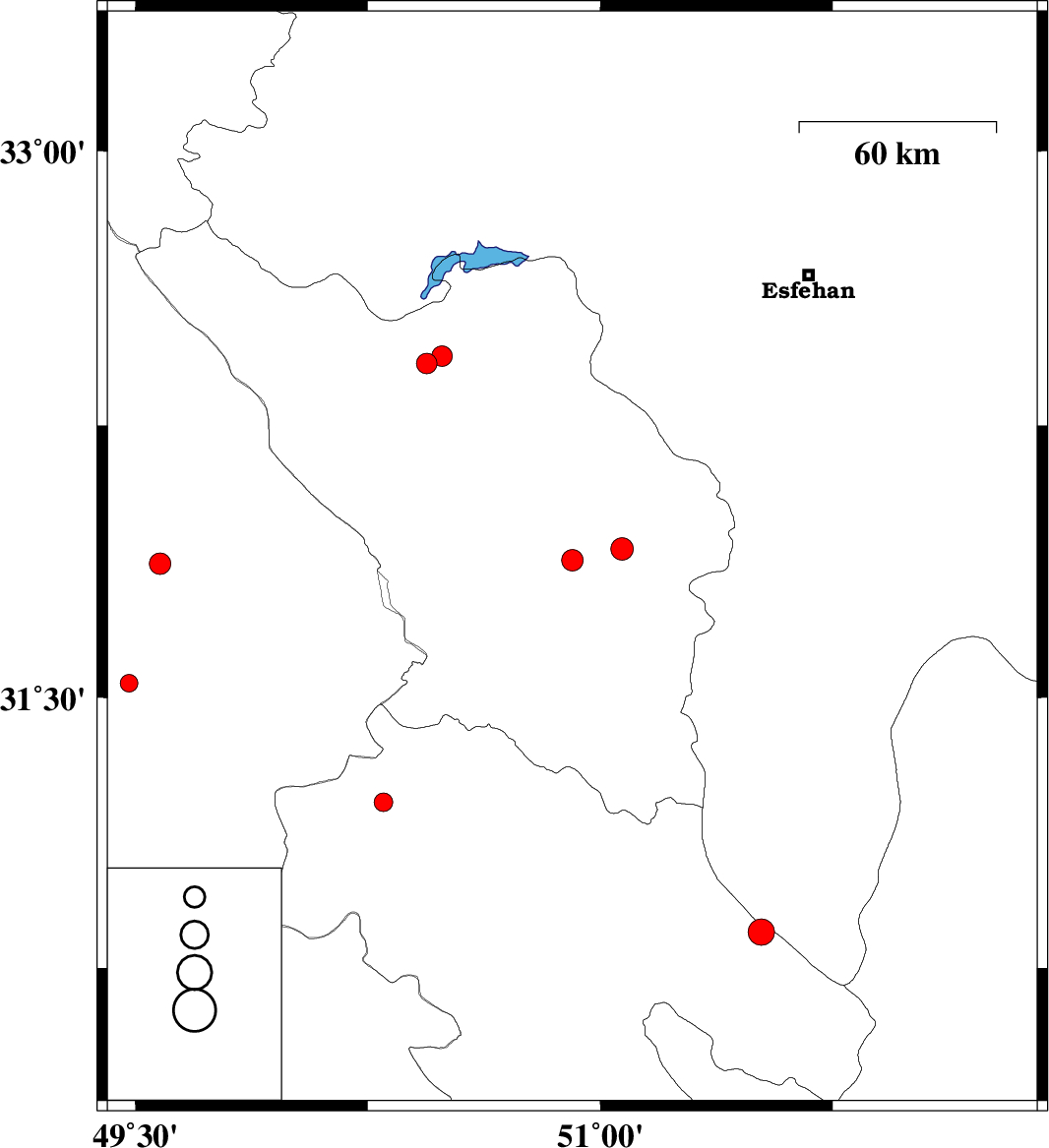 2014/11/04 | 13:04:16.7 | 16:34:16.7 | 31.91 | 51.07 | 14 | ML3.3 | Chaharmahal Bakhtiari Province, 21 km West of Borujen | ||