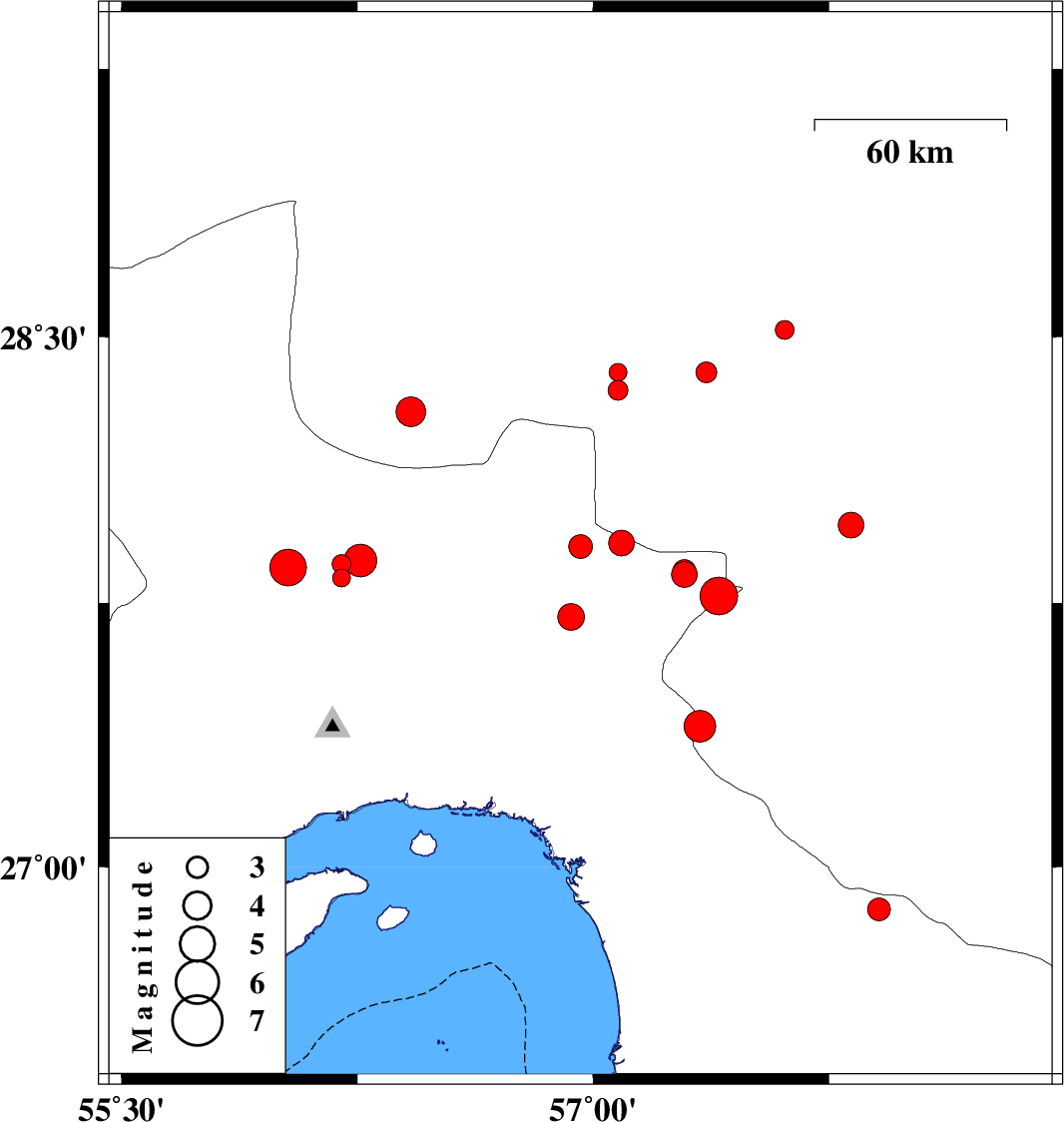 | 2014/11/16 | 05:13:05.2 | 08:43:05.2 | 28.29 | 56.42 | 16 | ML4.3 | Kerman Province, 50 km East of Hajiabad | ||