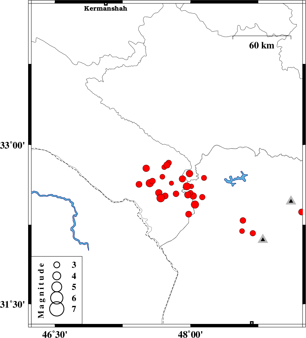 2014/11/14 | 01:12:48.4 | 04:42:48.4 | 32.5 | 47.67 | 15 | ML3.9 | Ilam Province, 44 km South-East of Dehloran | ||