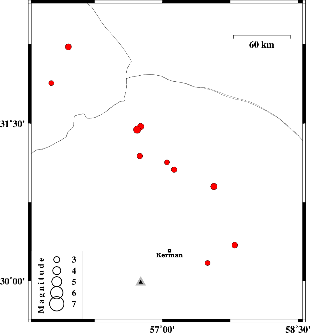 | 2014/11/08 | 22:01:40.3 | 01:31:40.3 | 30.17 | 57.5 | 14 | ML2.6 | Kerman Province, 42 km South-East of Kerman | ||