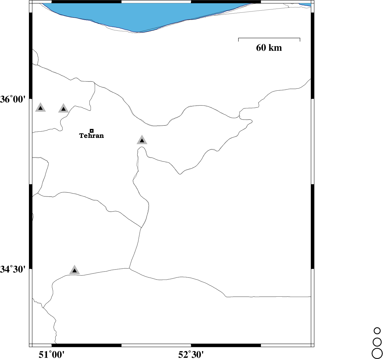 2014/11/13 | 19:01:24.8 | 22:31:24.8 | 35.77 | 51.98 | 14 | ML1.6 | Tehran Province, 10 km Damavand | ||