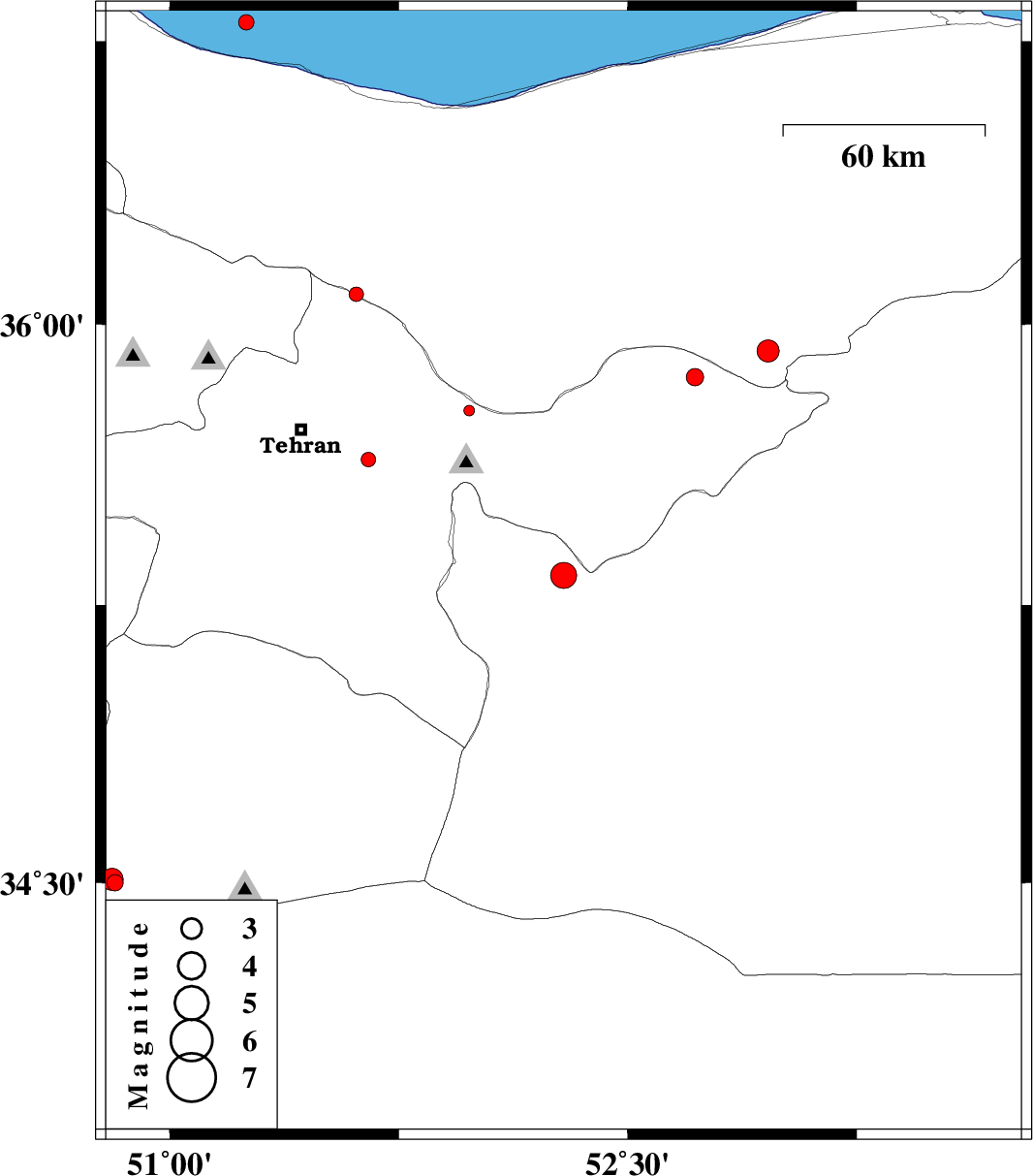 | 2014/11/17 | 09:34:30.8 | 13:04:30.8 | 36.8 | 51.25 | 16 | ML2.2 | Caspian Sea, 23 km North-West of Chalus | ||