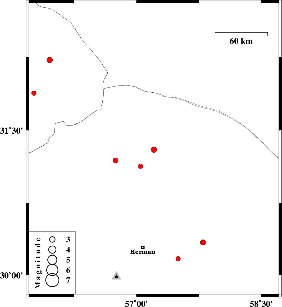 | 2014/11/08 | 22:01:40.3 | 01:31:40.3 | 30.17 | 57.5 | 14 | ML2.6 | Kerman Province, 42 km South-East of Kerman | ||