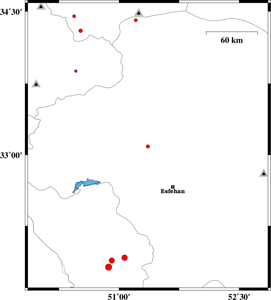 | 2014/12/04 | 13:33:46.8 | 17:03:46.8 | 33.09 | 51.36 | 14 | ML2 | Esfahan Province, 50 km North of Najafabad | ||