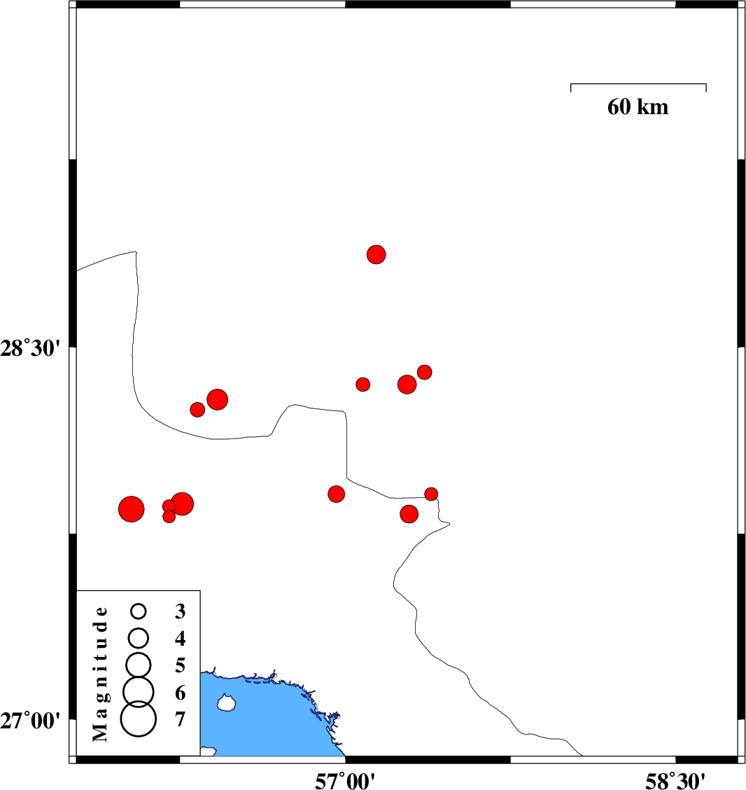 | 2014/11/21 | 02:57:52.6 | 06:27:52.6 | 27.91 | 57.39 | 14 | ML2.7 | Kerman Province, 30 km West of Kahnuj | ||