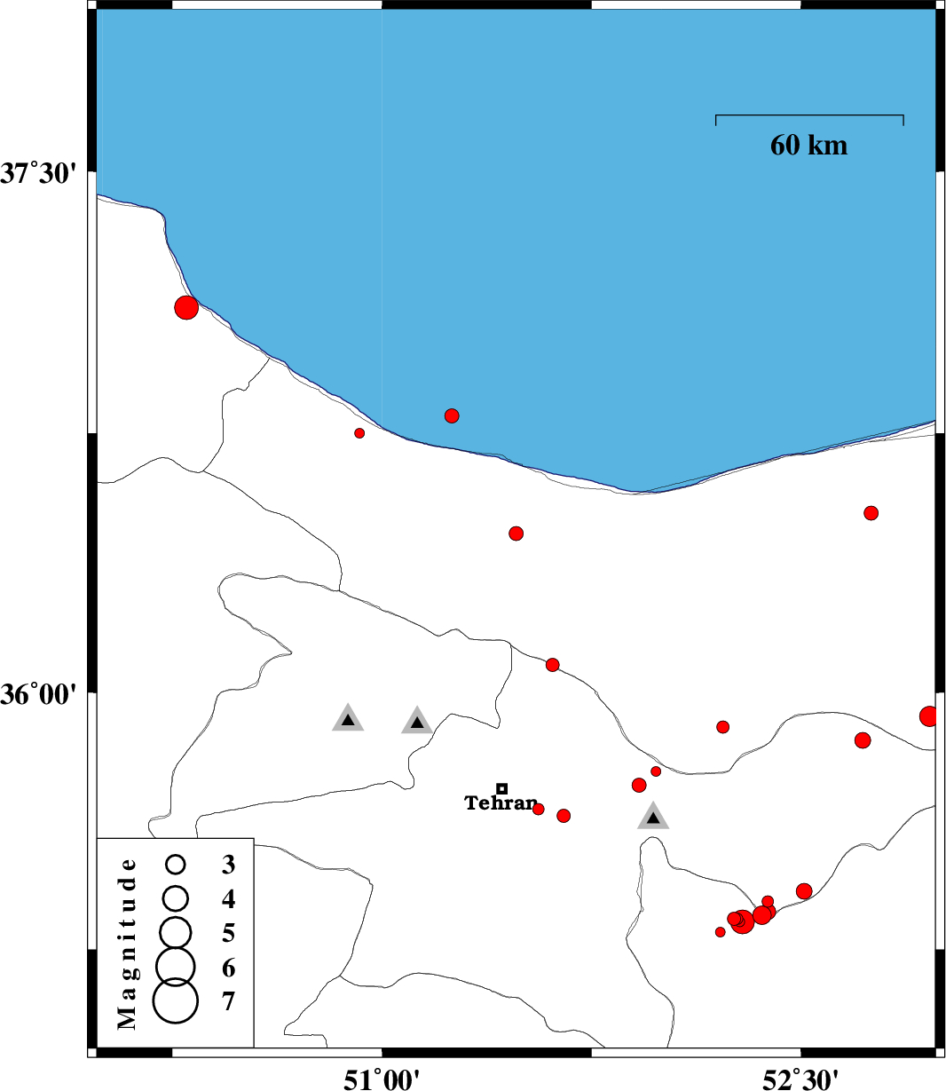 | 2014/11/17 | 09:34:30.8 | 13:04:30.8 | 36.8 | 51.25 | 16 | ML2.2 | Caspian Sea, 23 km North-West of Chalus | ||