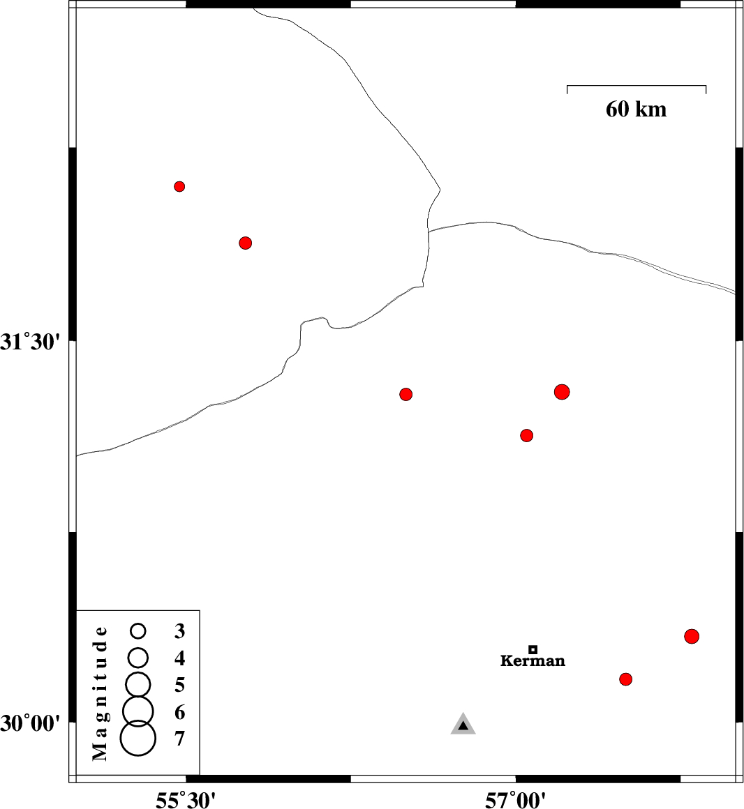 | 2014/11/08 | 22:01:40.3 | 01:31:40.3 | 30.17 | 57.5 | 14 | ML2.6 | Kerman Province, 42 km South-East of Kerman |