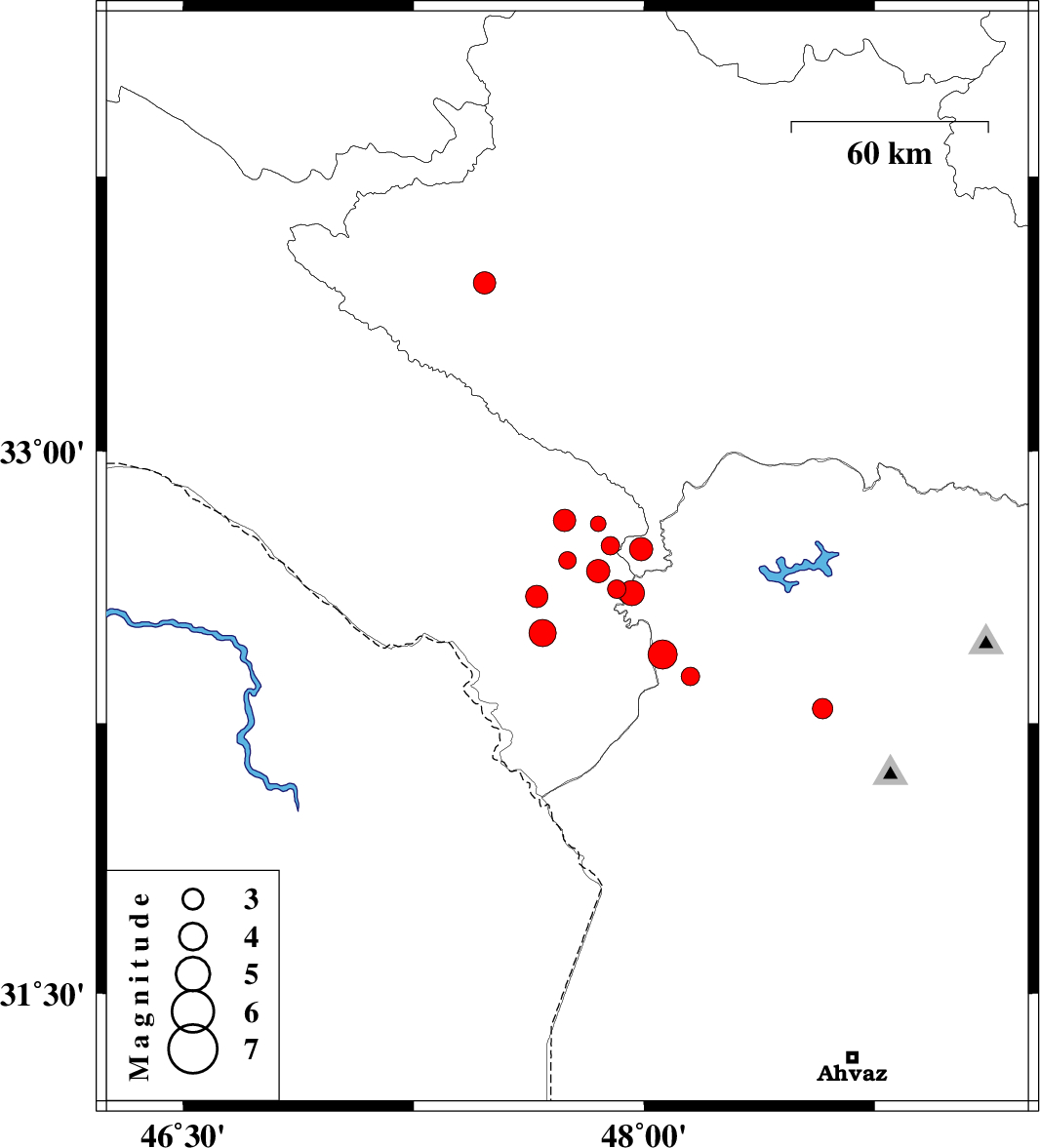 | 2014/11/19 | 21:18:19.6 | 00:48:19.6 | 32.29 | 48.58 | 16 | ML2.9 | Khoozestan Province, 20 km East of Dezful | ||