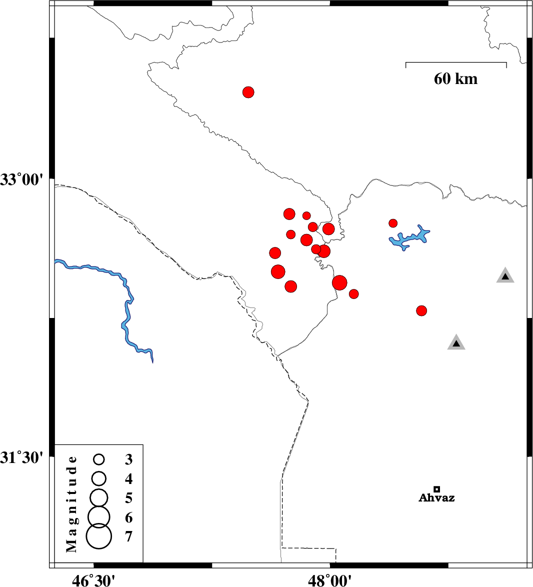 | 2014/11/14 | 01:12:48.4 | 04:42:48.4 | 32.5 | 47.67 | 15 | ML3.9 | Ilam Province, 44 km South-East of Dehloran | ||