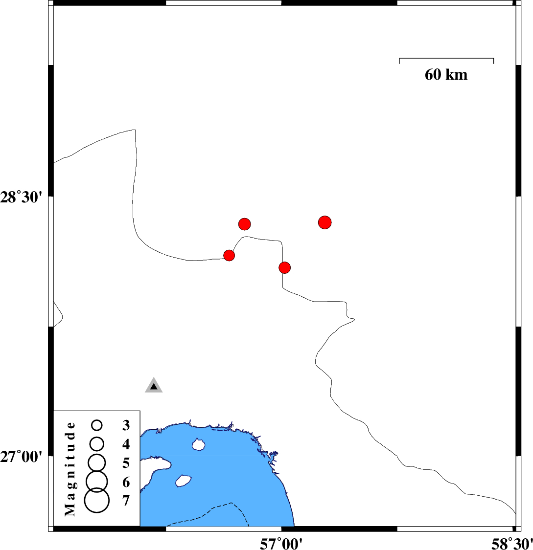 | 2014/12/05 | 00:20:27.5 | 03:50:27.5 | 28.35 | 57.28 | 14 | ML3.8 | Kerman Province, 57 km South-West of Jiroft |