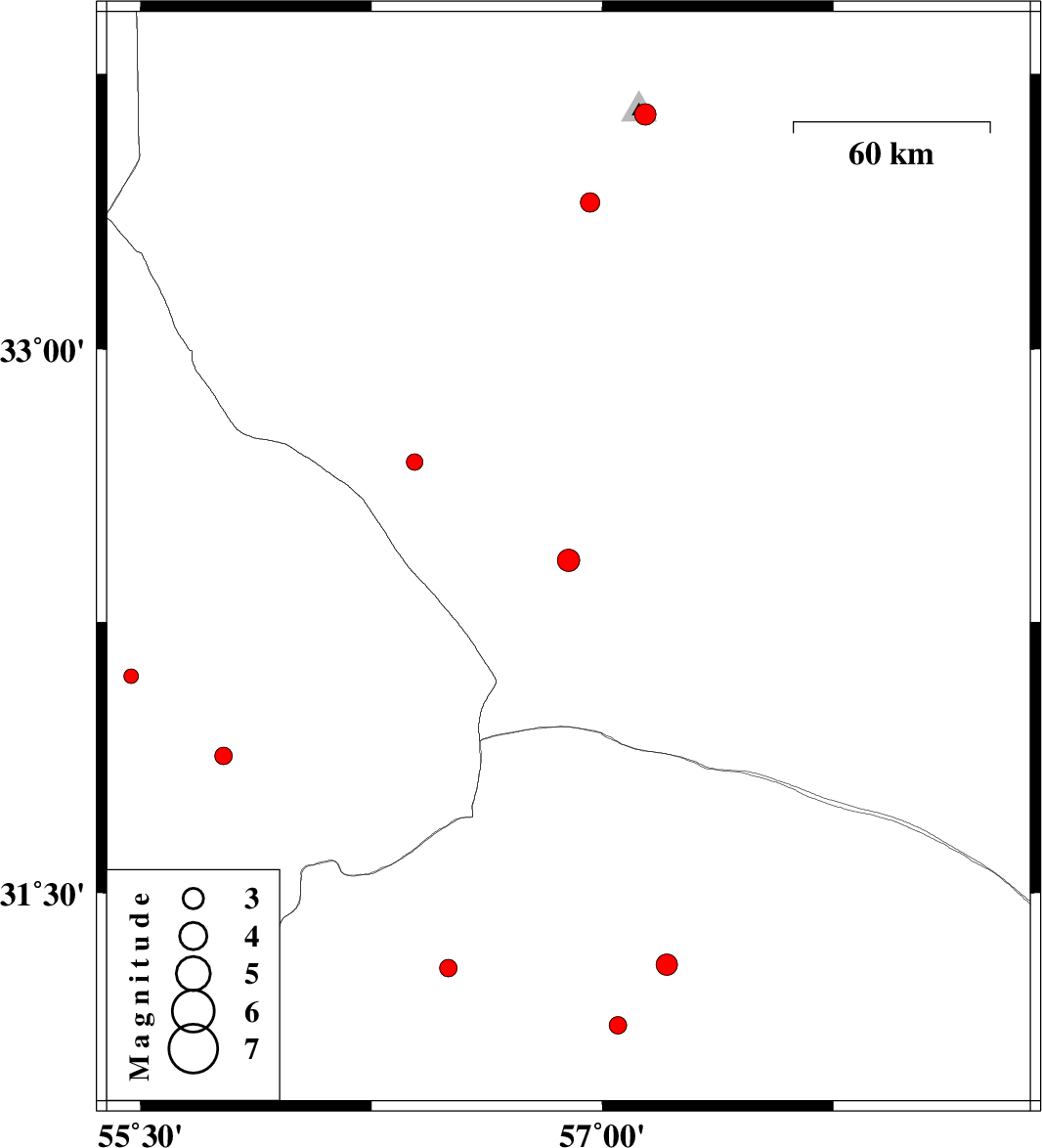 | 2014/12/13 | 05:17:56.5 | 08:47:56.5 | 33.64 | 57.14 | 12 | ML3.1 | Yazd Province, 20 km East of Tabas | ||