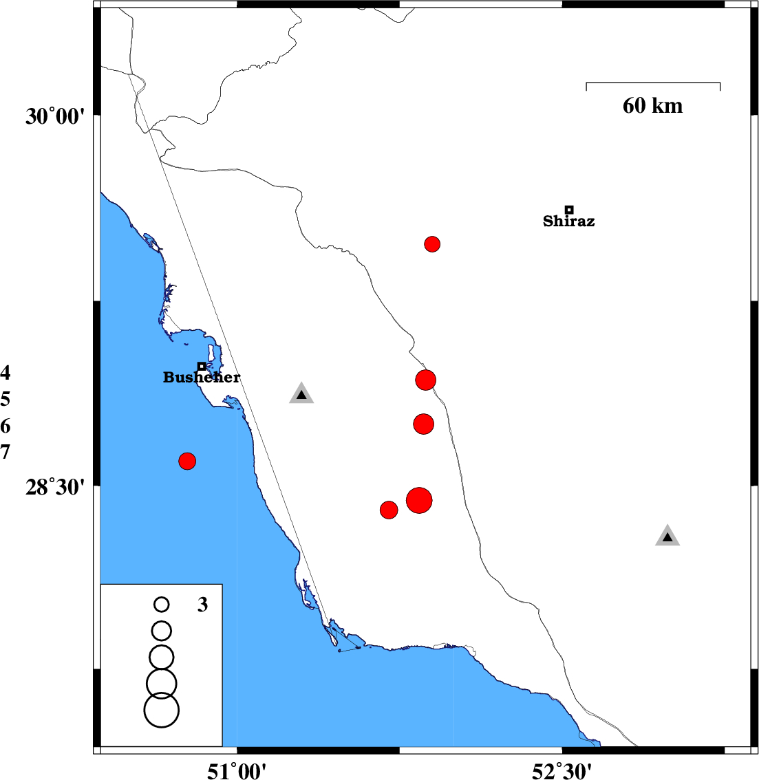2014/12/29 13:00:08.1 16:30:08.1 28.650.7717 ML3.5 Persian Gulf, 43 km South of Busheher