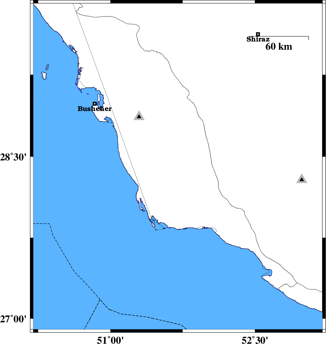 | 2014/12/29 | 13:00:08.1 | 16:30:08.1 | 28.6 | 50.77 | 17 | ML3.5 | Persian Gulf, 43 km South of Busheher | ||