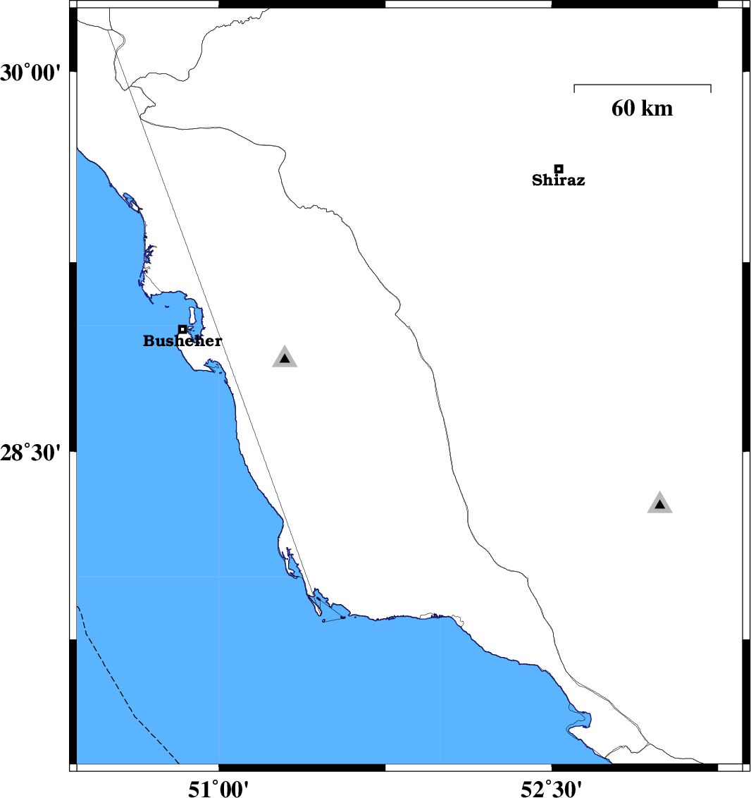 2014/12/30 | 05:23:05.1 | 08:53:05.1 | 28.93 | 51.87 | 16 | ML4.3 | Bushehr Province, 22 km West of Farashband | ||