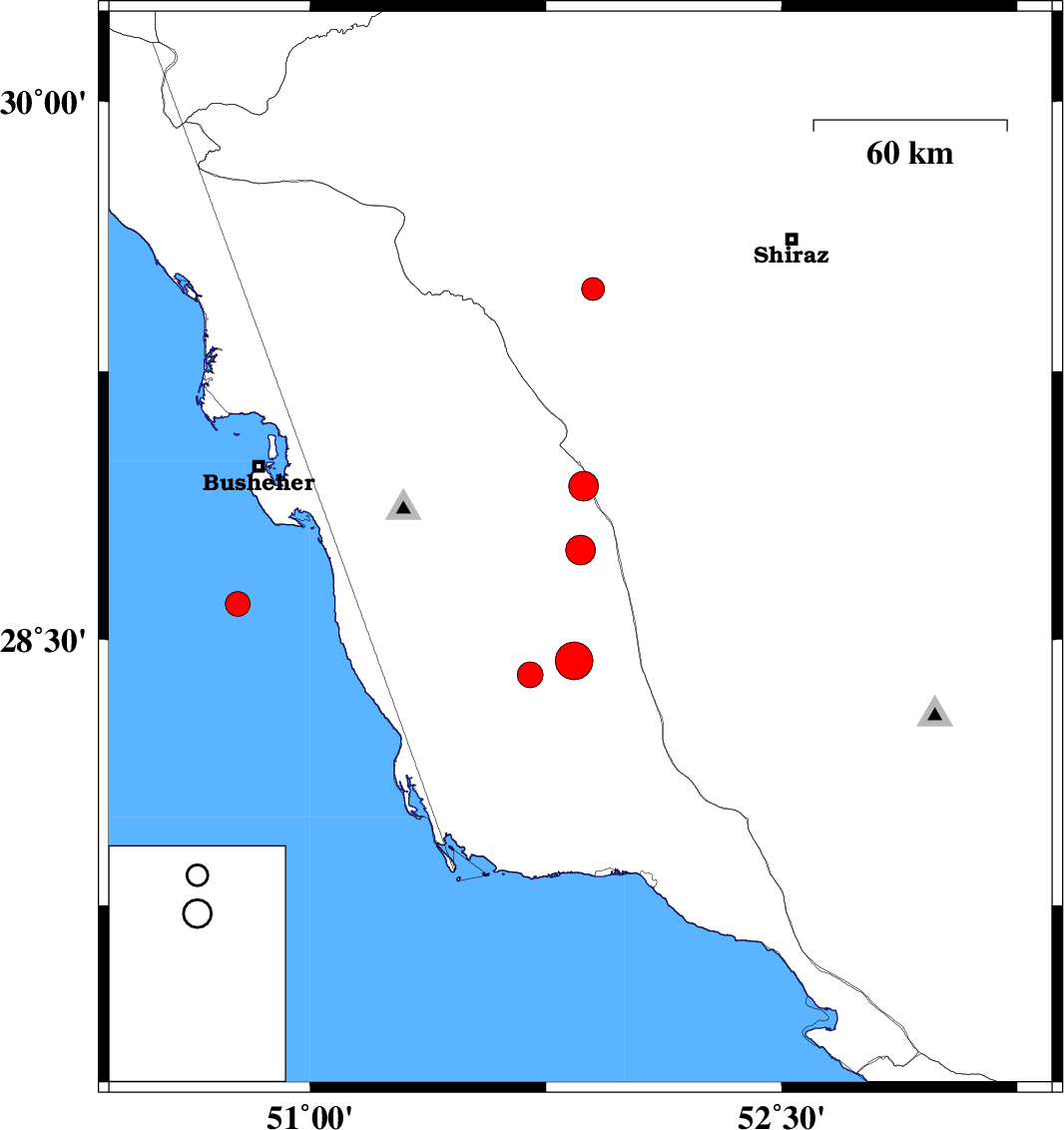 | 2014/12/30 | 13:23:22.3 | 16:53:22.3 | 28.4 | 51.7 | 16 | ML3.6 | Bushehr Province, 42 km South-East of Khormog | ||