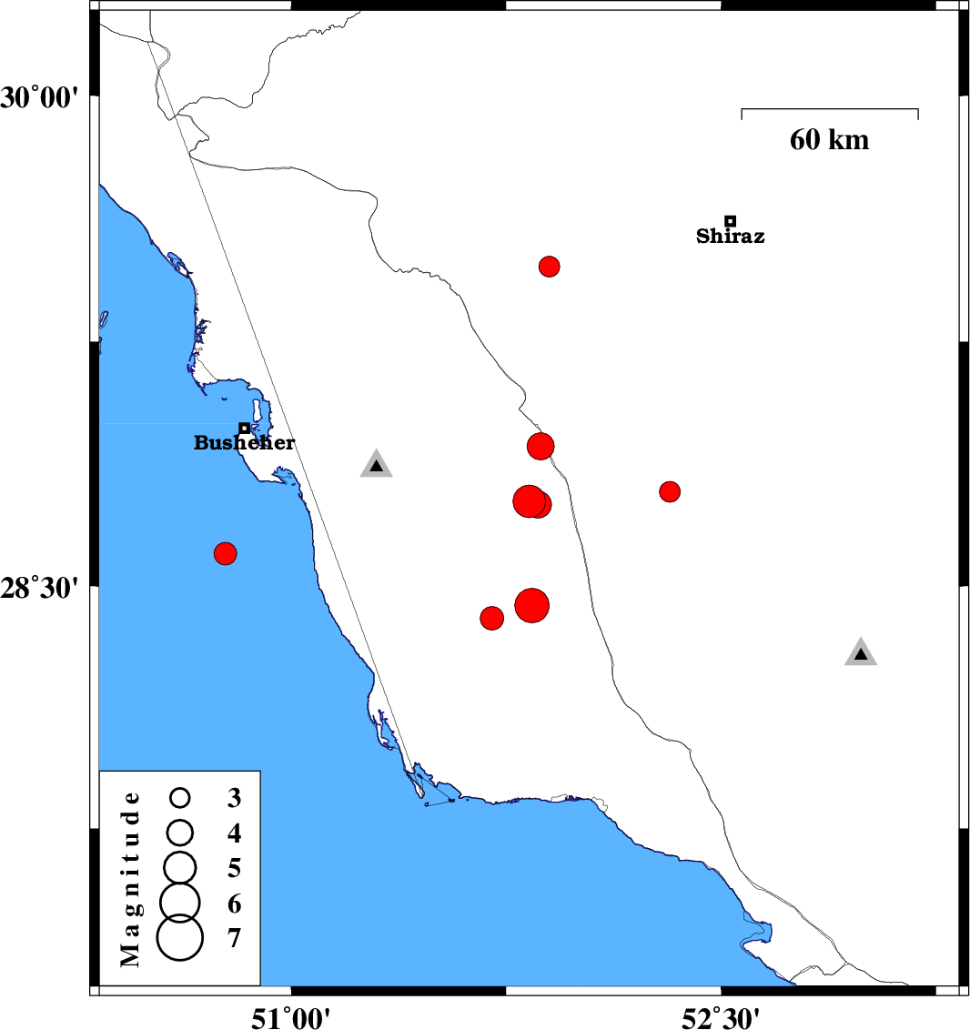 | 2014/12/29 | 13:00:08.1 | 16:30:08.1 | 28.6 | 50.77 | 17 | ML3.5 | Persian Gulf, 43 km South of Busheher | ||