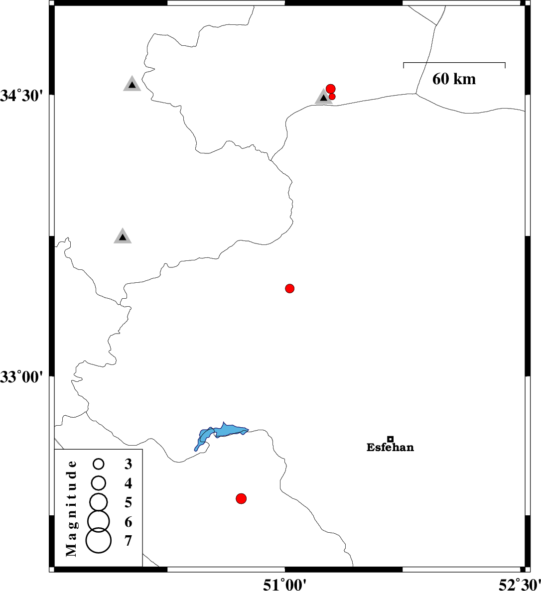 | 2015/01/03 | 18:38:24.5 | 22:08:24.5 | 33.47 | 51.03 | 6 | ML2.5 | Esfahan Province, 69 km East of Golpayegan | ||