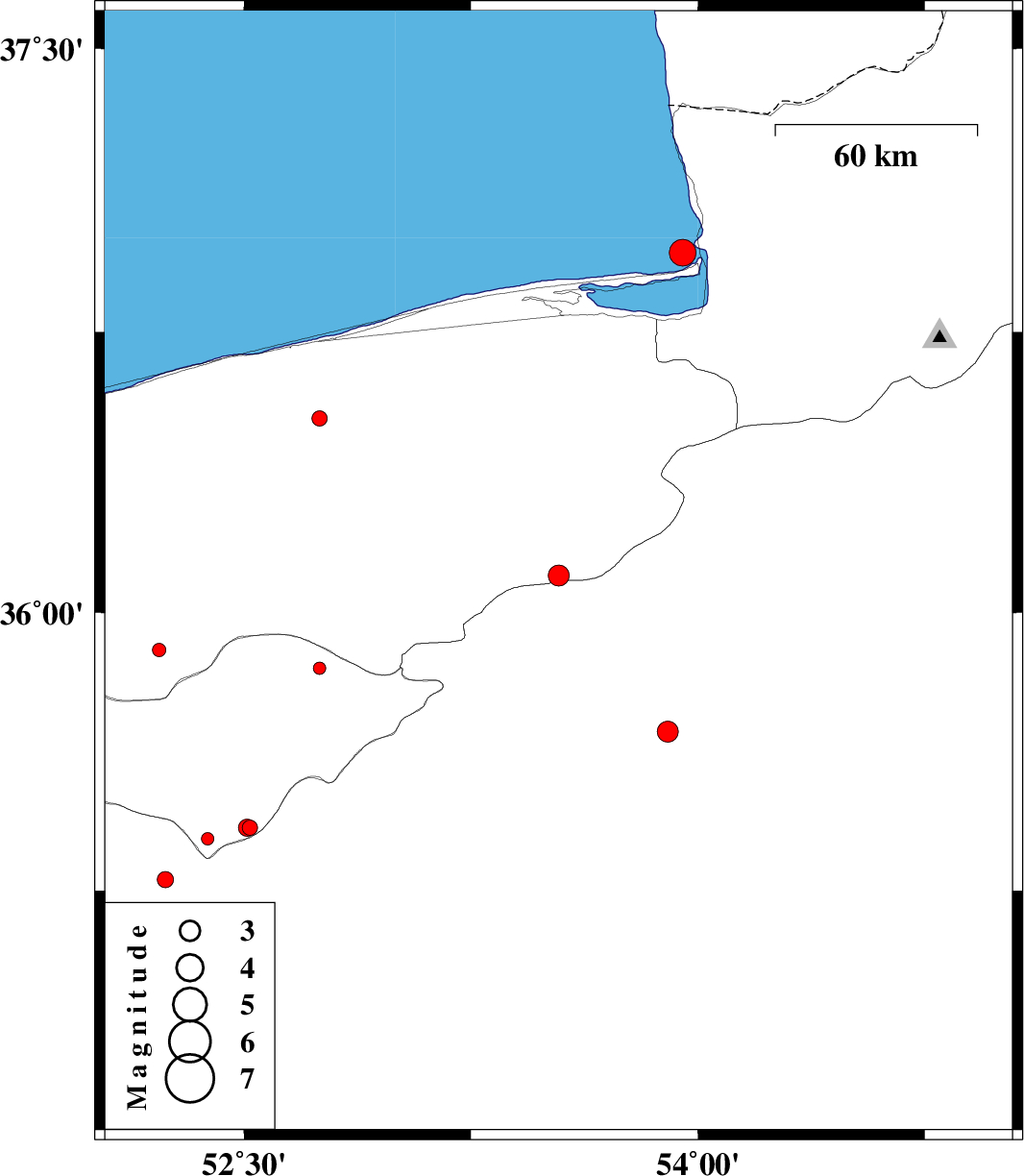 | 2014/12/05 | 02:49:29.8 | 06:19:29.8 | 36.96 | 53.95 | 15 | ML4 | Caspian Sea, 13 km West of Bandar-e torkaman |