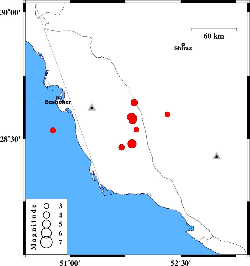 2014/12/29 | 13:00:08.1 | 16:30:08.1 | 28.6 | 50.77 | 17 | ML3.5 | Persian Gulf, 43 km South of Busheher |
