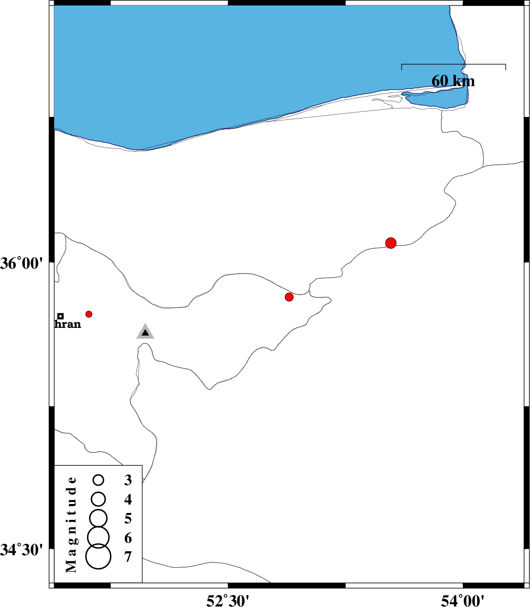 2015/01/04 | 17:01:19.8 | 20:31:19.8 | 36.1 | 53.54 | 14 | ML3.1 | Mazandaran Province, 43 km East of Pol-E-Sefid |
