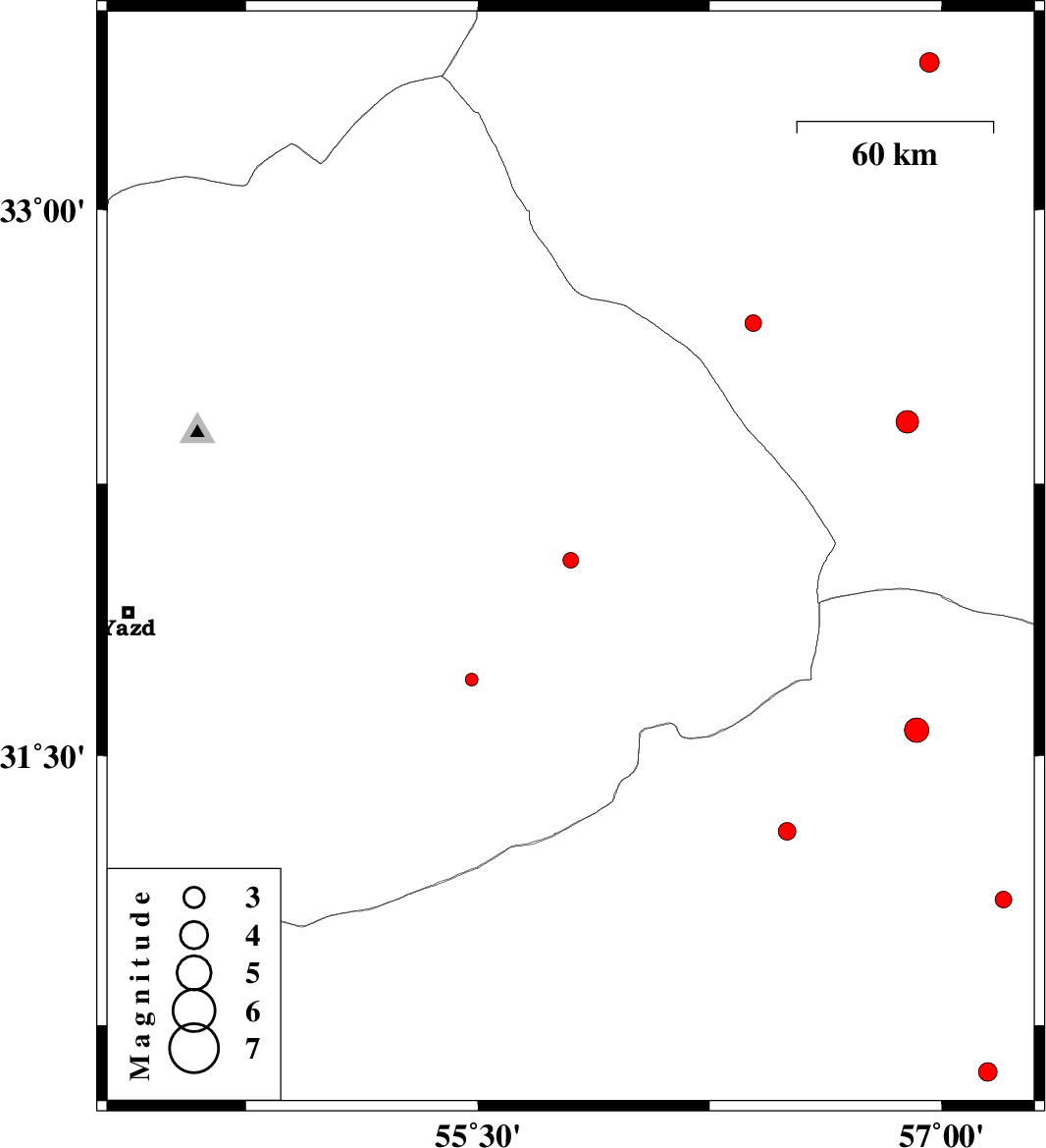 | 2014/12/16 | 18:15:34.9 | 21:45:34.9 | 33.4 | 56.96 | 18 | ML2.8 | Yazd Province, 23 km South of Tabas | ||