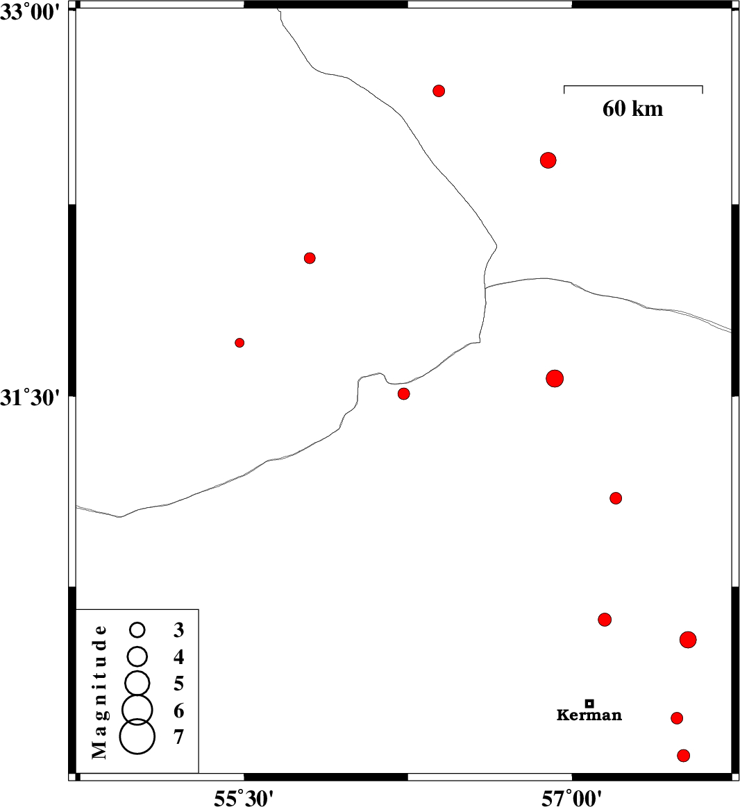 | 2014/12/12 | 04:10:43.8 | 07:40:43.8 | 30.54 | 57.53 | 14 | ML3.4 | Kerman Province, 51 km North-East of Kerman |