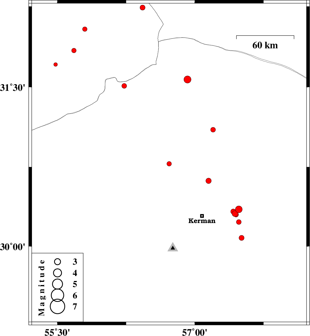 | 2015/01/16 | 06:43:04.0 | 10:13:04.0 | 30.3 | 57.45 | 14 | ML2.4 | Kerman Province, 36 km East of Kerman | ||