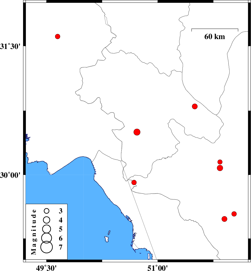 | 2014/12/21 | 09:42:44.1 | 13:12:44.1 | 29.91 | 50.68 | 14 | ML3 | Fars Province, 40 km North-East of Bandar-e genaveh |