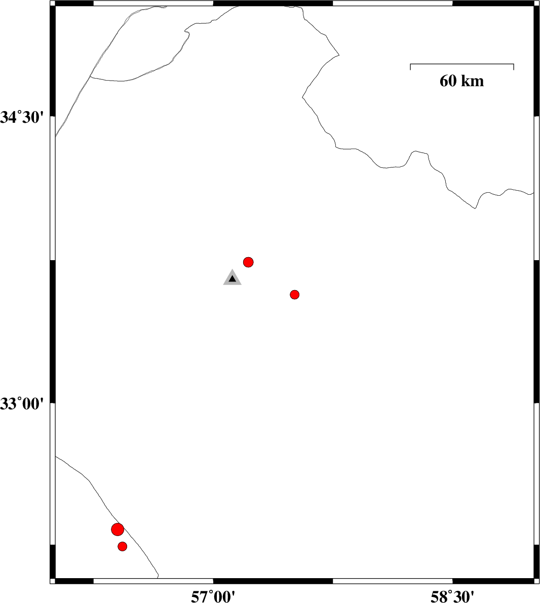 | 2015/01/19 | 04:11:50.0 | 07:41:50.0 | 33.57 | 57.51 | 14 | ML2.5 | Khorasan(center) Province, 54 km East of Tabas | ||