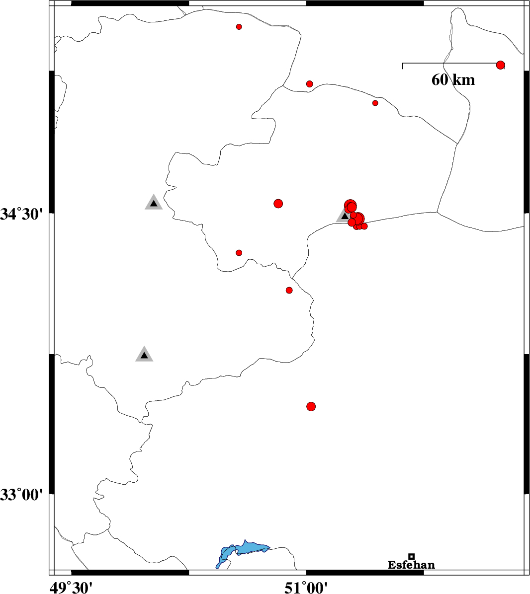 | 2015/01/03 | 18:38:24.5 | 22:08:24.5 | 33.47 | 51.03 | 6 | ML2.5 | Esfahan Province, 69 km East of Golpayegan | ||