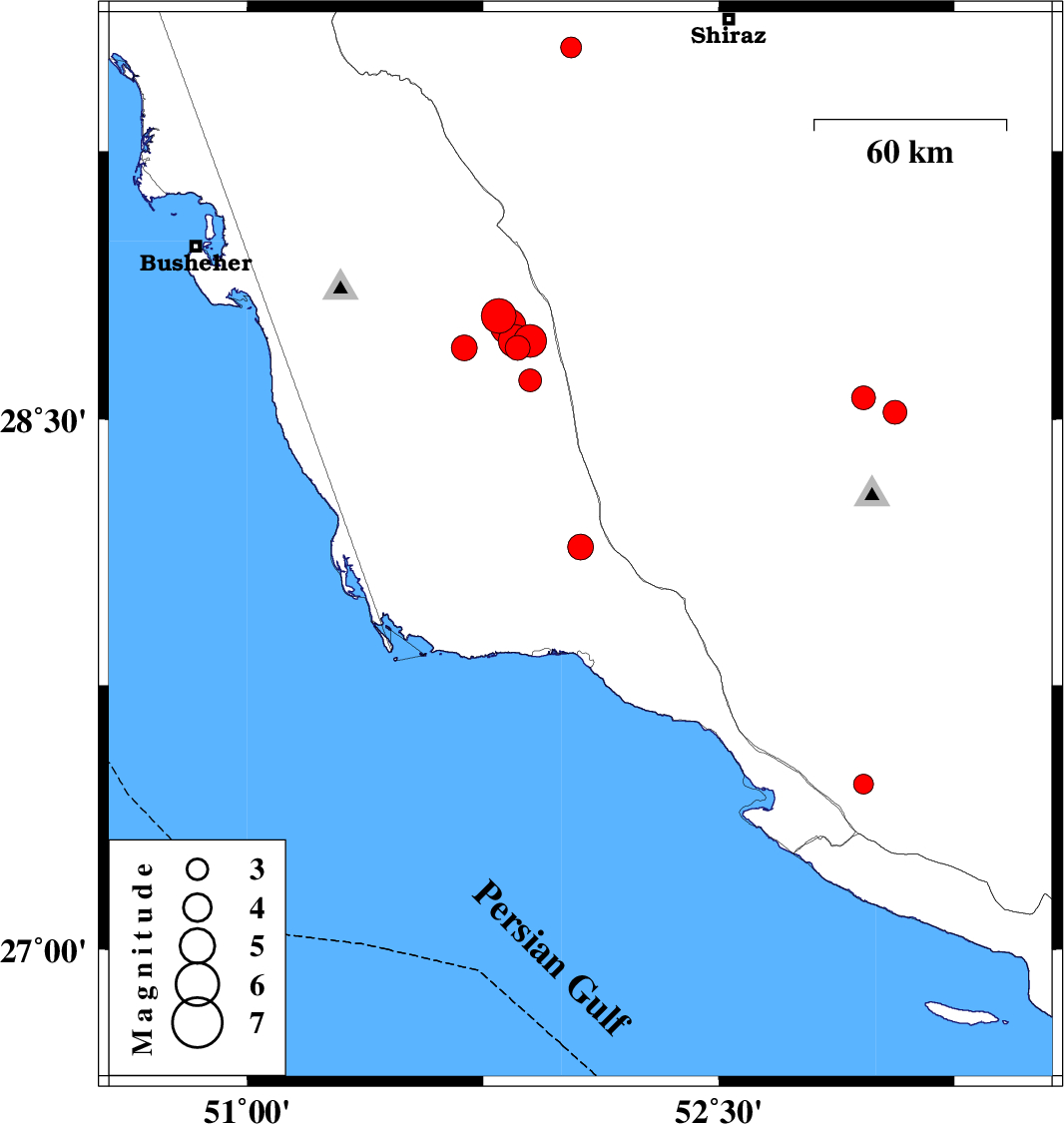 | 2015/01/01 | 08:49:54.2 | 12:19:54.2 | 28.76 | 51.83 | 17 | ML5.1 | Bushehr Province, 28 km South-West of Farashband |