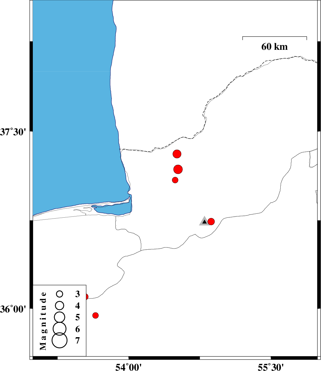2015/01/05 | 12:43:33.8 | 16:13:33.8 | 37.18 | 54.52 | 15 | ML4.2 | Golestan Province, 19 km North of Aq Qaleh | ||
