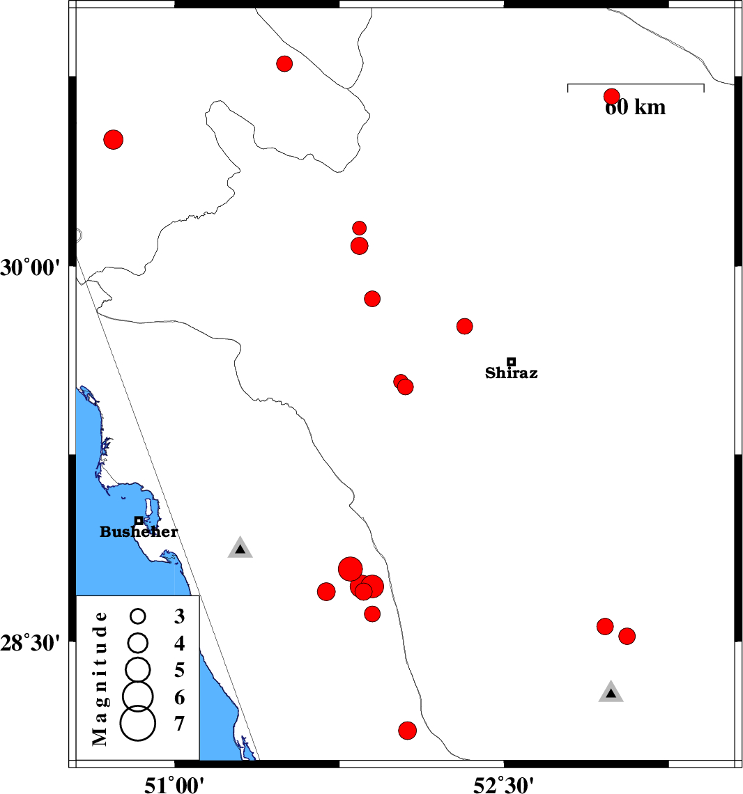 | 2015/01/07 | 16:26:03.4 | 19:56:03.4 | 28.72 | 51.9 | 7 | ML4.6 | Bushehr Province, 25 km South-West of Farashband | ||