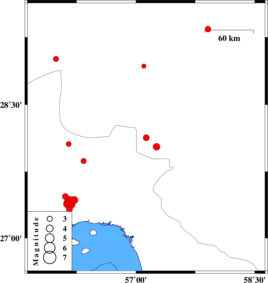 | 2015/02/10 | 18:49:50.4 | 22:19:50.4 | 28.13 | 57.13 | 6 | ML3.5 | Kerman Province, 59 km North-West of Kahnuj | ||