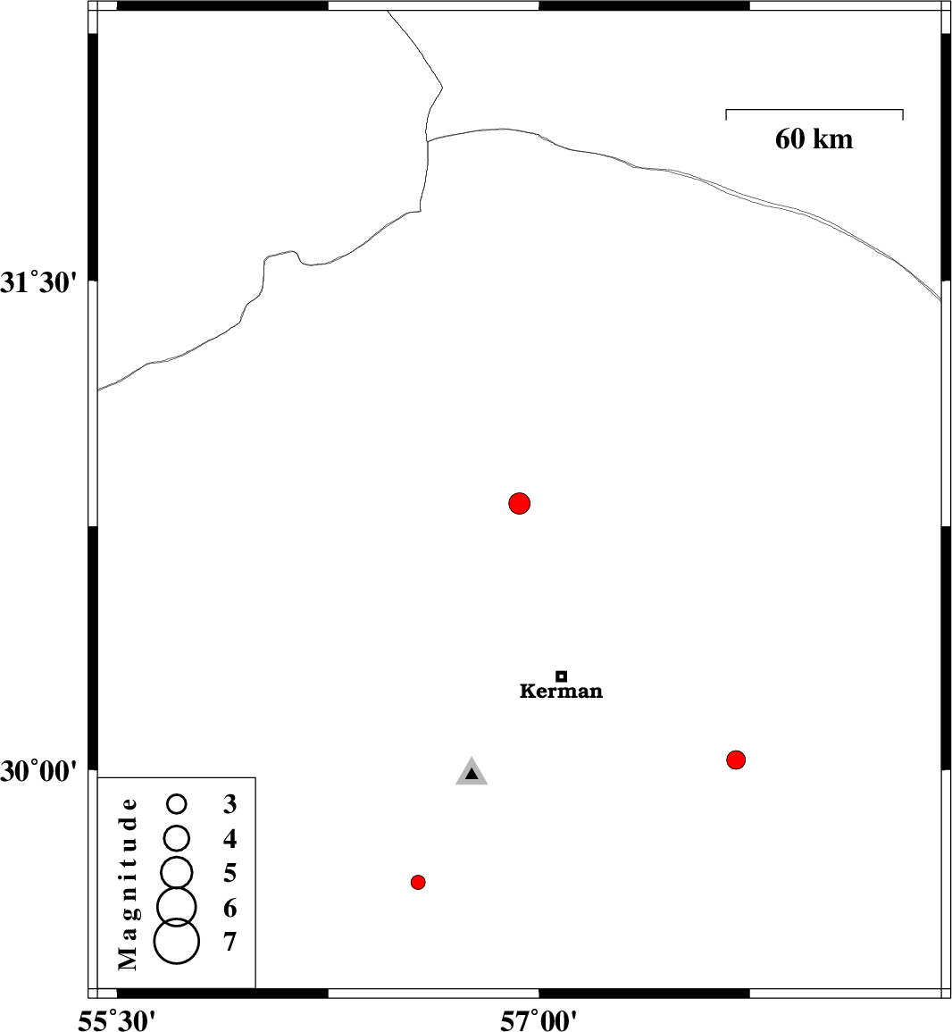 | 2015/02/04 | 02:18:35.7 | 05:48:35.7 | 30.03 | 57.7 | 16 | ML3 | Kerman Province, 66 km South-East of Kerman |