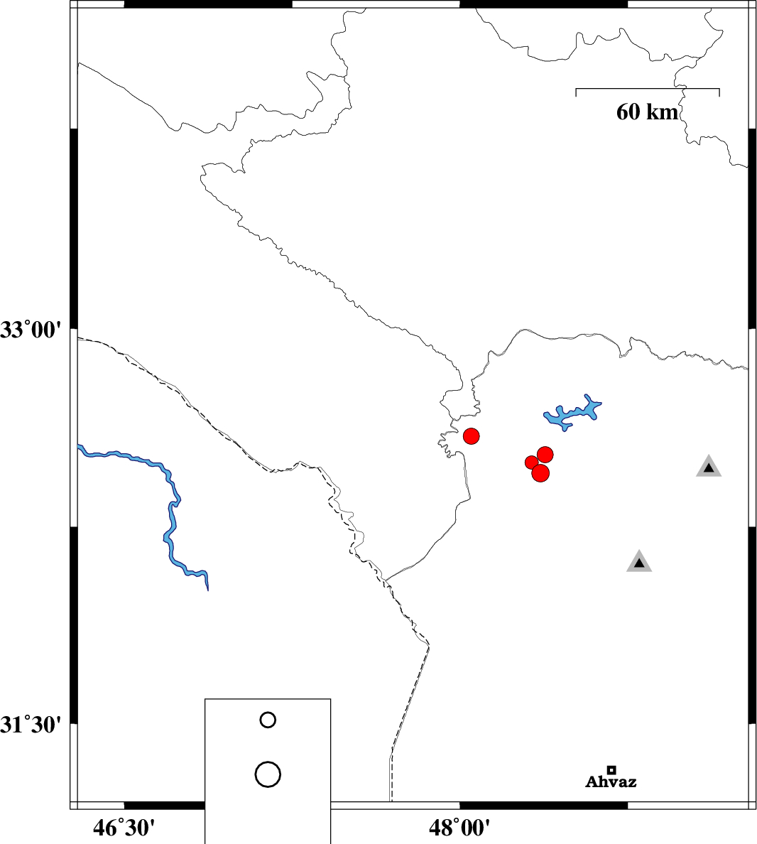 2015/02/12 | 20:20:12.6 | 23:50:12.6 | 32.27 | 48.74 | 14 | ML3.1 | Khoozestan Province, 27 km North-West of Shushtar | ||