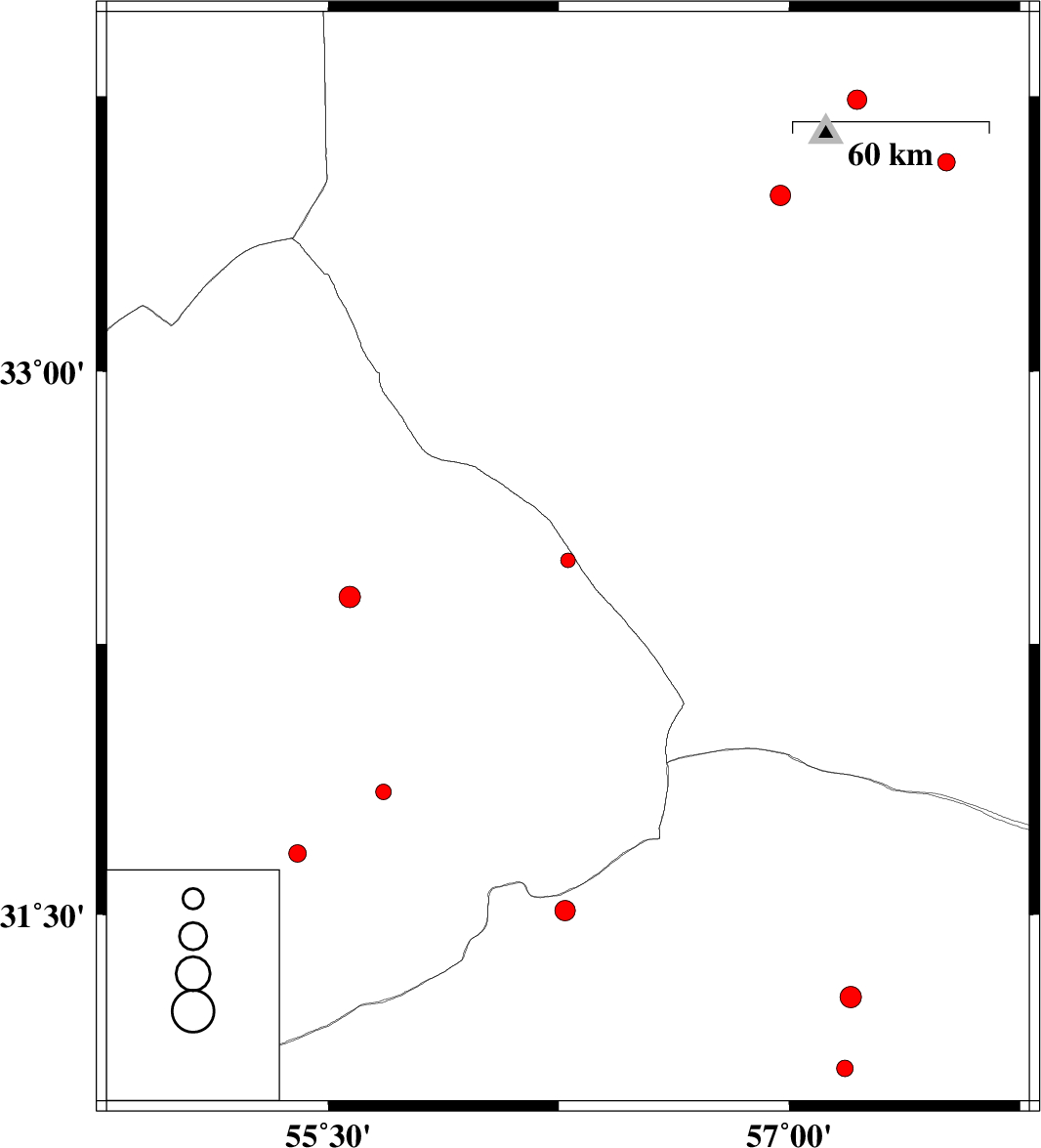| 2015/01/28 | 15:12:49.1 | 18:42:49.1 | 31.51 | 56.27 | 17 | ML3 | Kerman Province, 58 km North-West of Ravar | ||