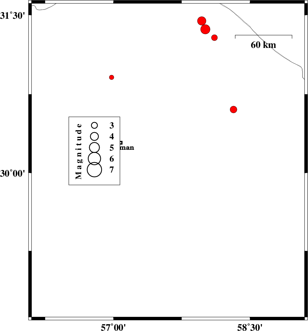 | 2015/02/04 | 02:18:35.7 | 05:48:35.7 | 30.03 | 57.7 | 16 | ML3 | Kerman Province, 66 km South-East of Kerman | ||