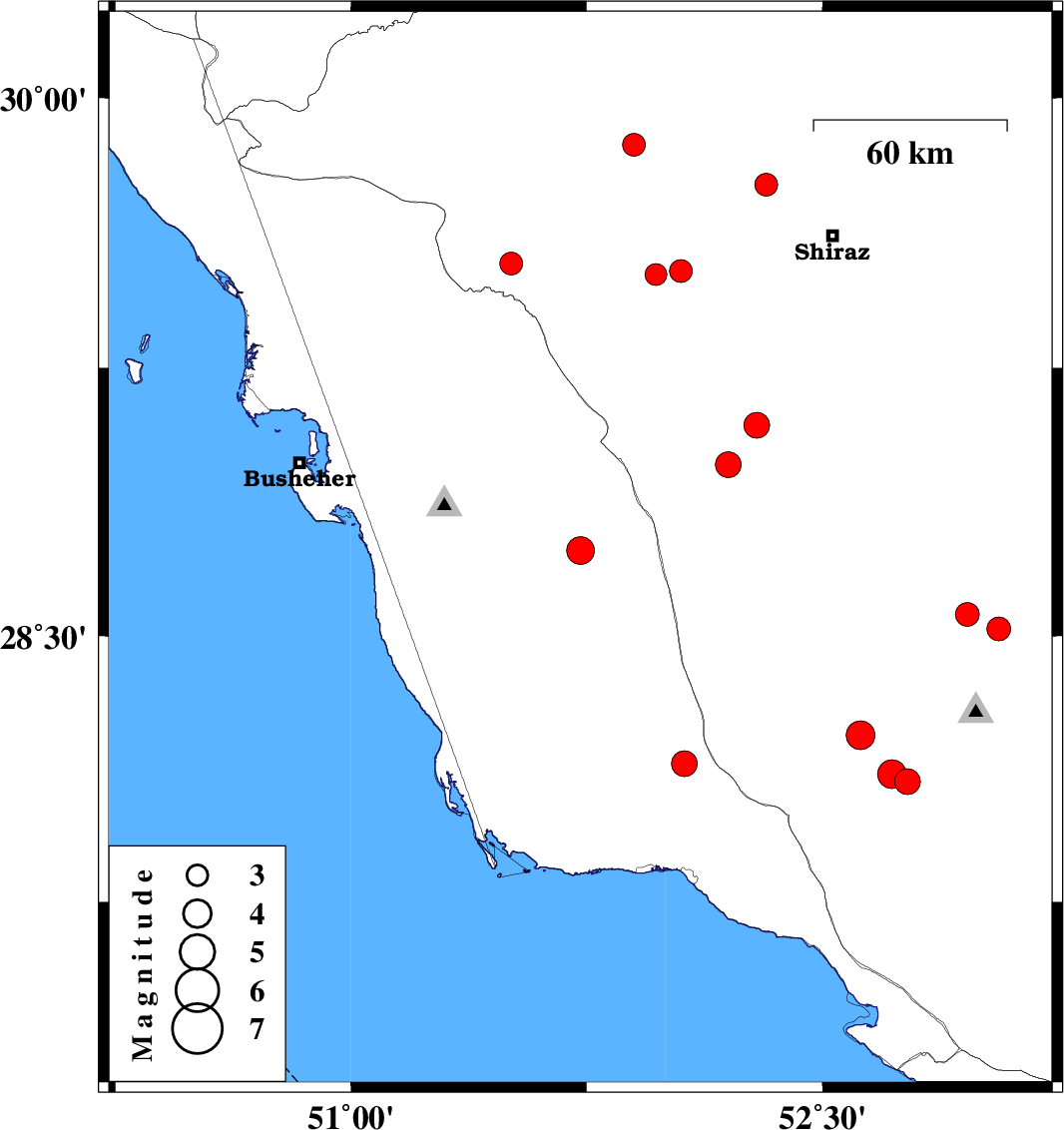 | 2015/02/11 | 09:21:12.5 | 12:51:12.5 | 29.54 | 51.51 | 6 | ML3.3 | Fars Province, 17 km West of Kazerun | ||